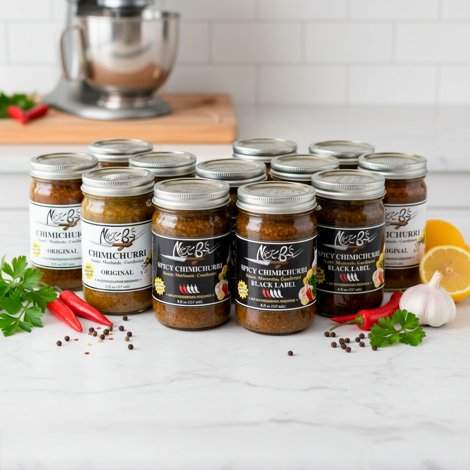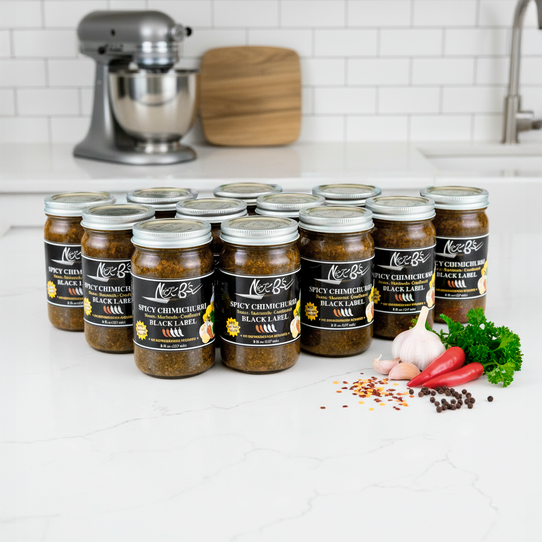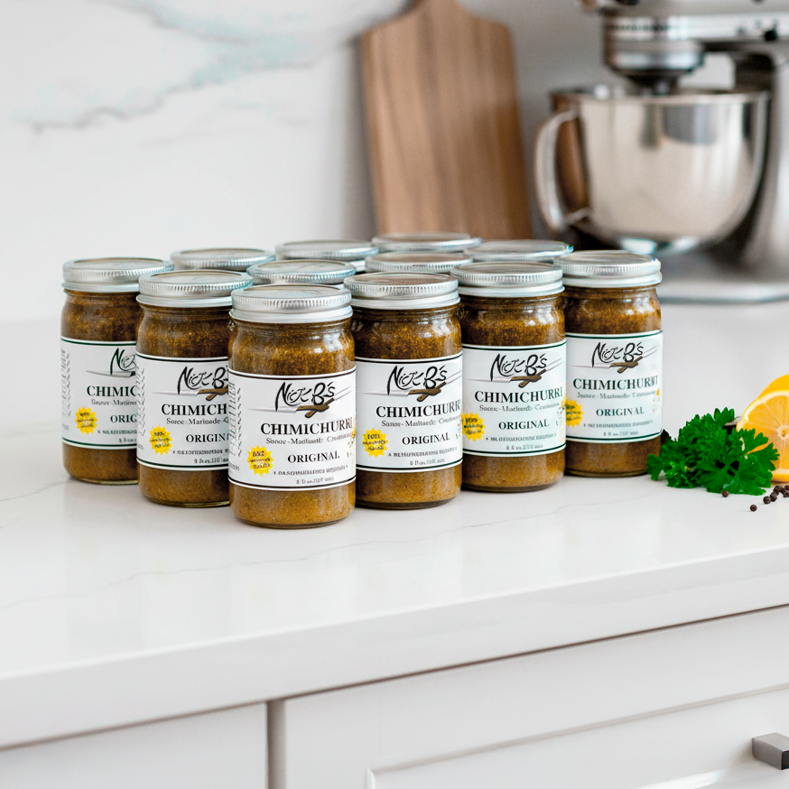 A dozen jars of handcrafted chimichurri, made with fresh herbs and premium oils.