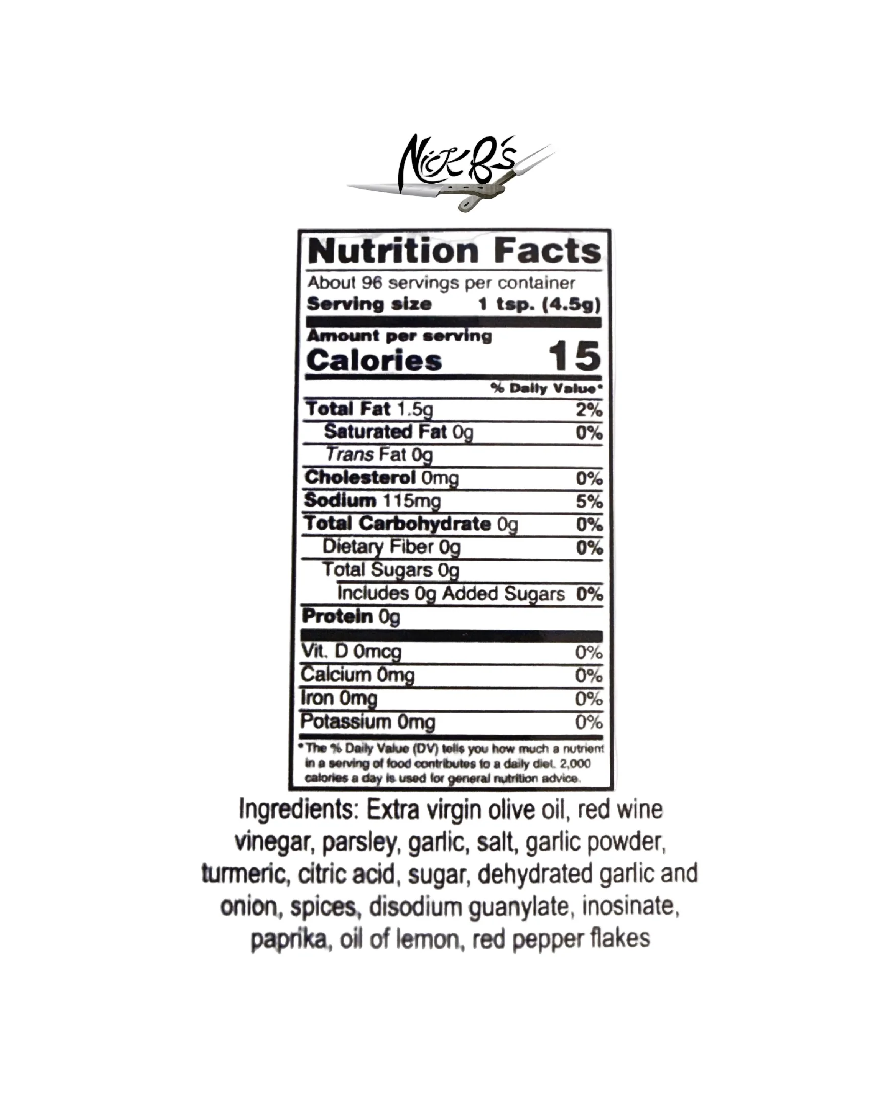 Nick B's best kept family recipe that has been perfected throughout the years. Our chimichurri is the perfect blend of naturally fresh parsley, fresh garlic, olive oil, red vinegar & a blend of spices, ultimately creating the perfectly bold, yet not spicy flavor favorited for years!