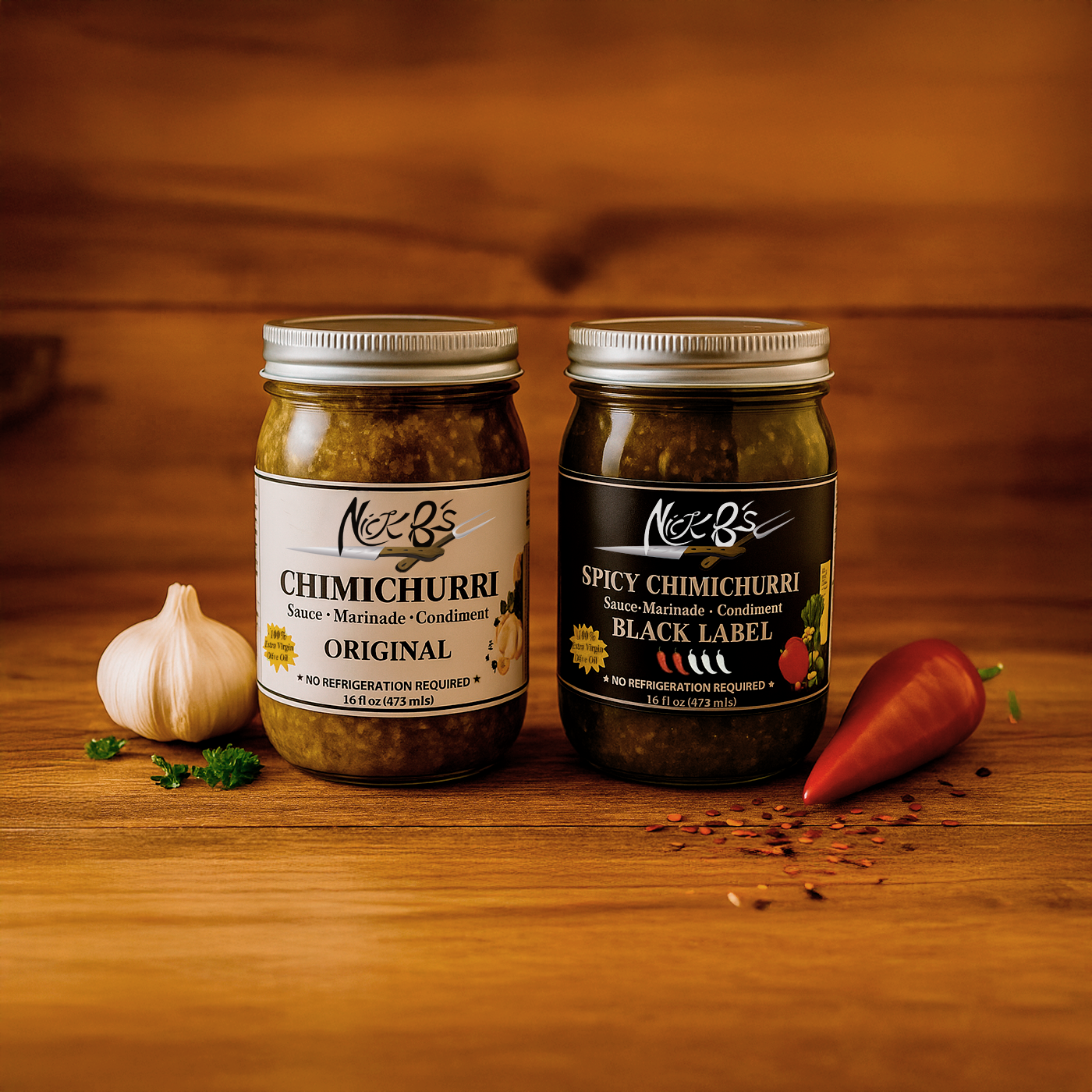 For those who know what they love — and want more of it. The Signature Set includes two full-size 16 oz jars of Nick B’s handcrafted chimichurri. Choose your flavor combination: